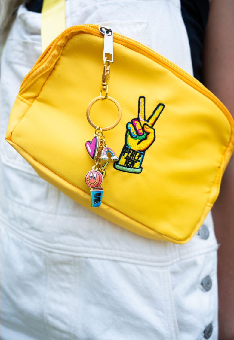 Peace Tea Crossbody bags with heat adhessive personalization patches and bag charms.